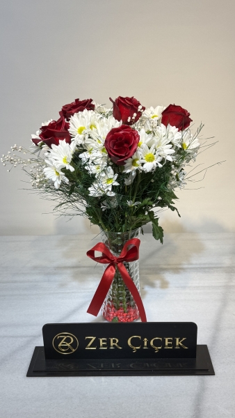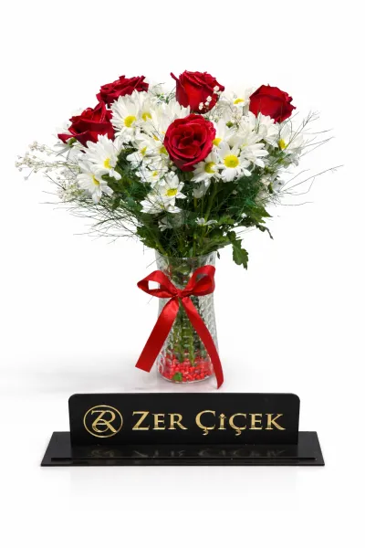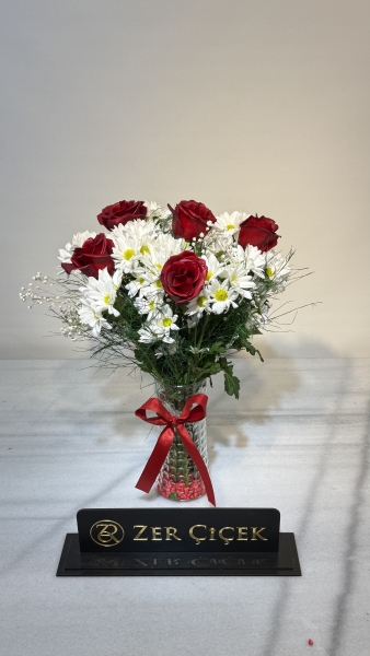 Vazoda taze papatya ve gül buketi